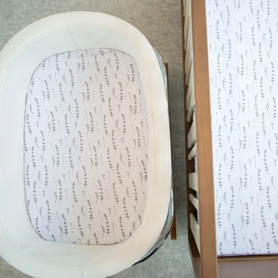 - This convenient two-pack features a modern and playful forest grey floral on white, combed jersey knit cotton. You can be rest assured that your baby�s sleep surface will always be covered with a clean, trendy, and soft cotton sheet with this bassinet sheet set!