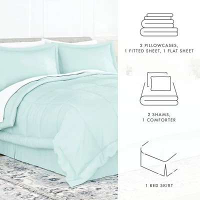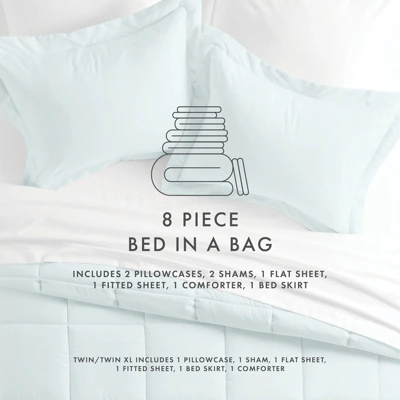 - 8PC comforter set includes 1 comforter, 1 bedskirt, 1 fitted sheet, 1 flat sheet, 2 pillowcases, and 2 pillow shams (Twin and TwinXL come as 6PC set with 1 pillowcase and 1 pillow sham)