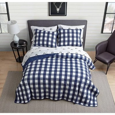 The iconic buffalo check plaid is a staple from the Eddie Bauer archive and this season it is re-imagined for spring as a soft pre-washed cotton quilt set in cool tones of indigo blue on white. A unique plaid quilt stitch in white thread is overlaid on the print creating textural interest as well as a distinct plaid pattern on the solid indigo reverse. Solid indigo also trims the edges of the quilt and shams for a clean, tailored finish. Twin quilt set includes: one twin quilt (88″l x 68″w) and one standard sham (21″l x 27″w), full/queen quilt set includes: one full/queen (90″l x 90″w) and two standard shams (21″l x 27″w), king quilt set includes: one king quilt (96″l x 104″w) and two king shams (21″l x 37″w). Machine Washable.